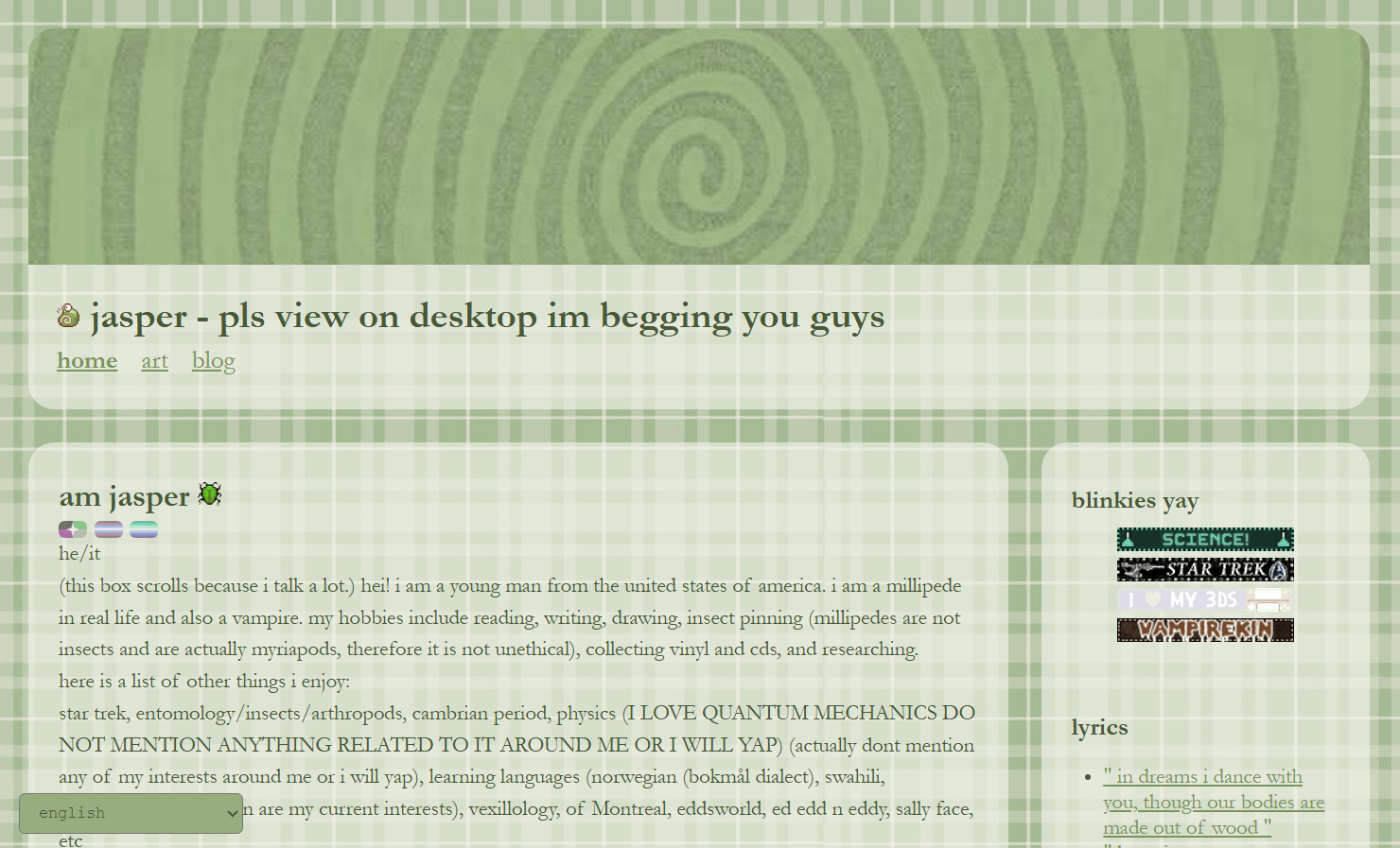 (this box scrolls because i talk a lot.) hei! i am a young man from the united states of america. i am a millipede in real life and also a vampire. my hobbies include reading, writing, drawing, insect pinning (millipedes are not insects and are actually myriapods, therefore it is not unethical), collecting vinyl and cds, and researching.